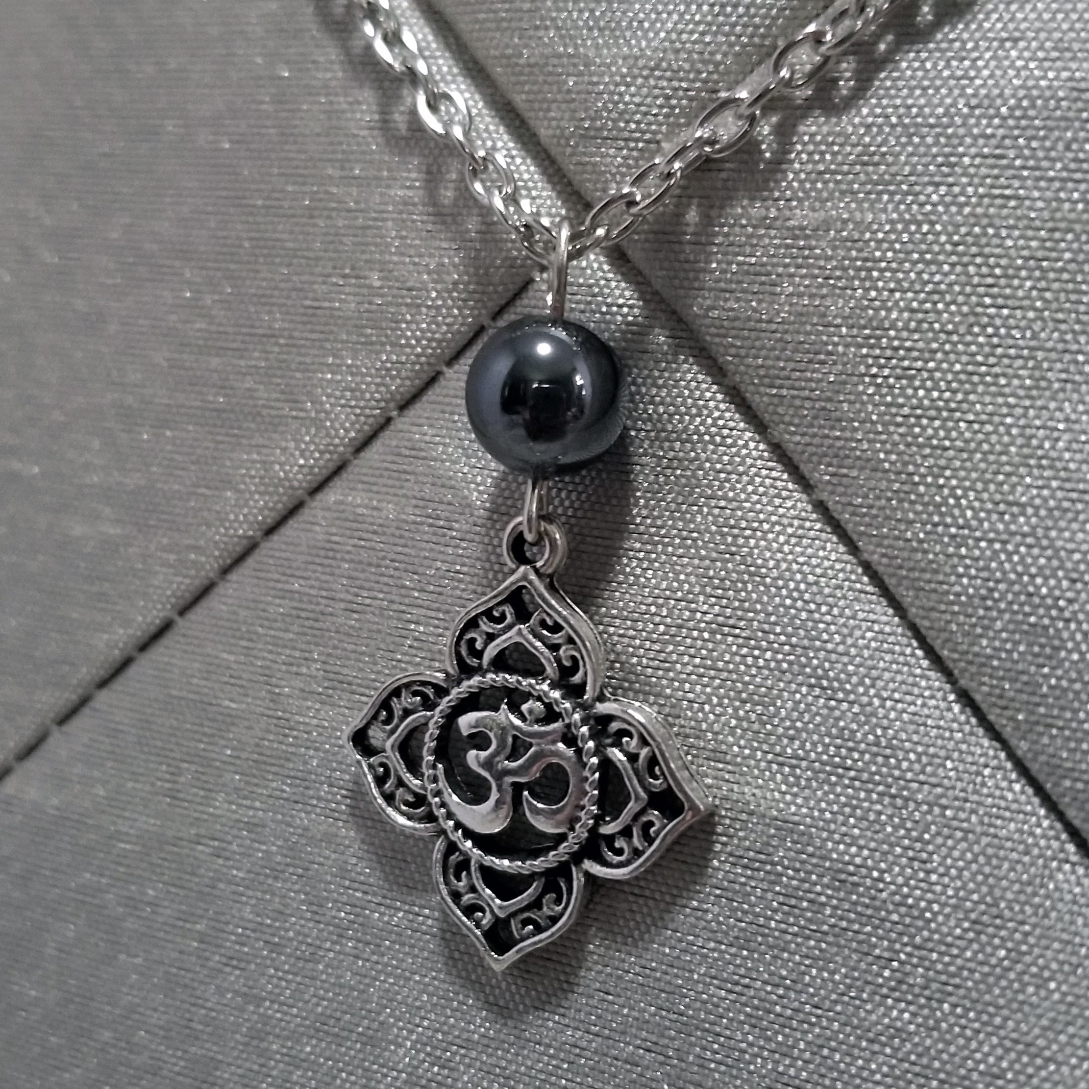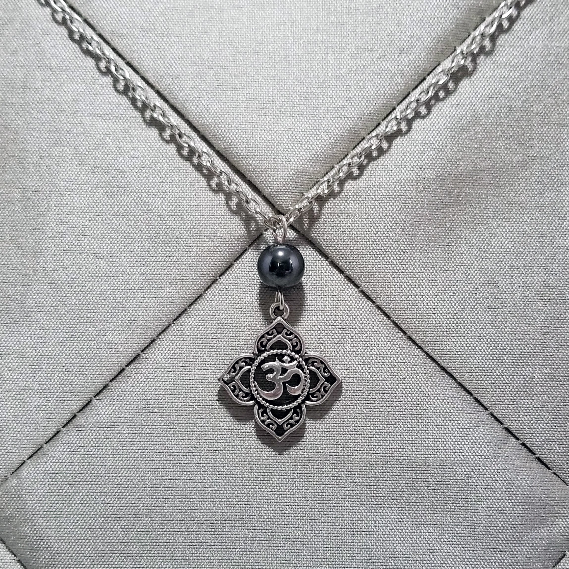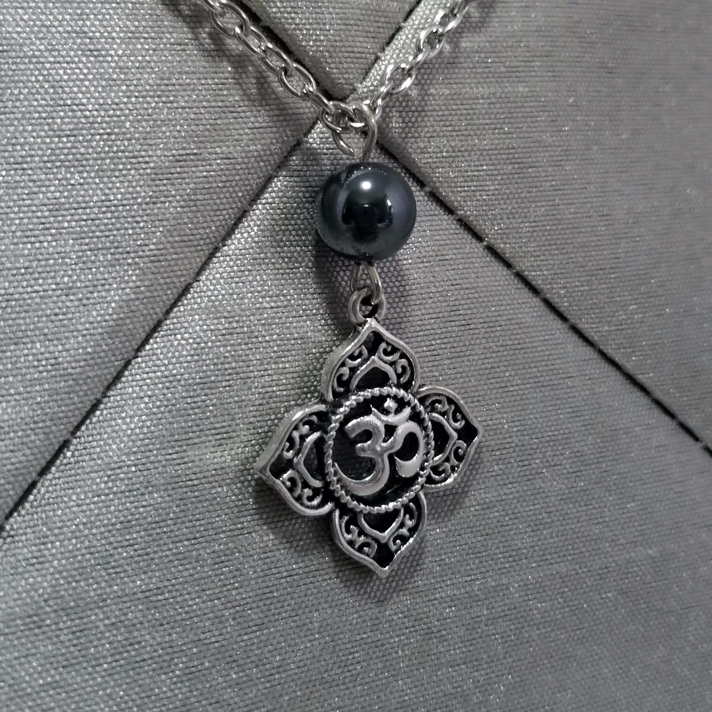 Wellness and glamour unite in this 2cm OM charm with 6mm hematite sphere on an adjustable 18″ to 20″ silvertone necklace with a lobster clasp.